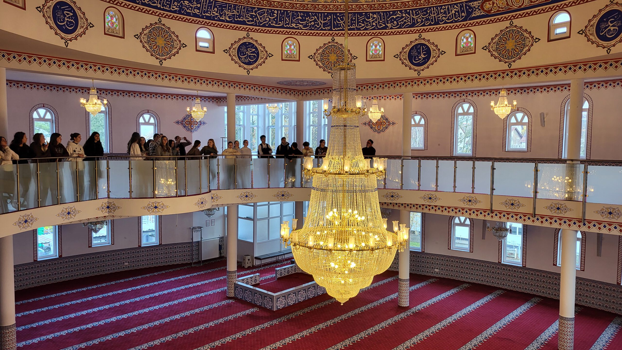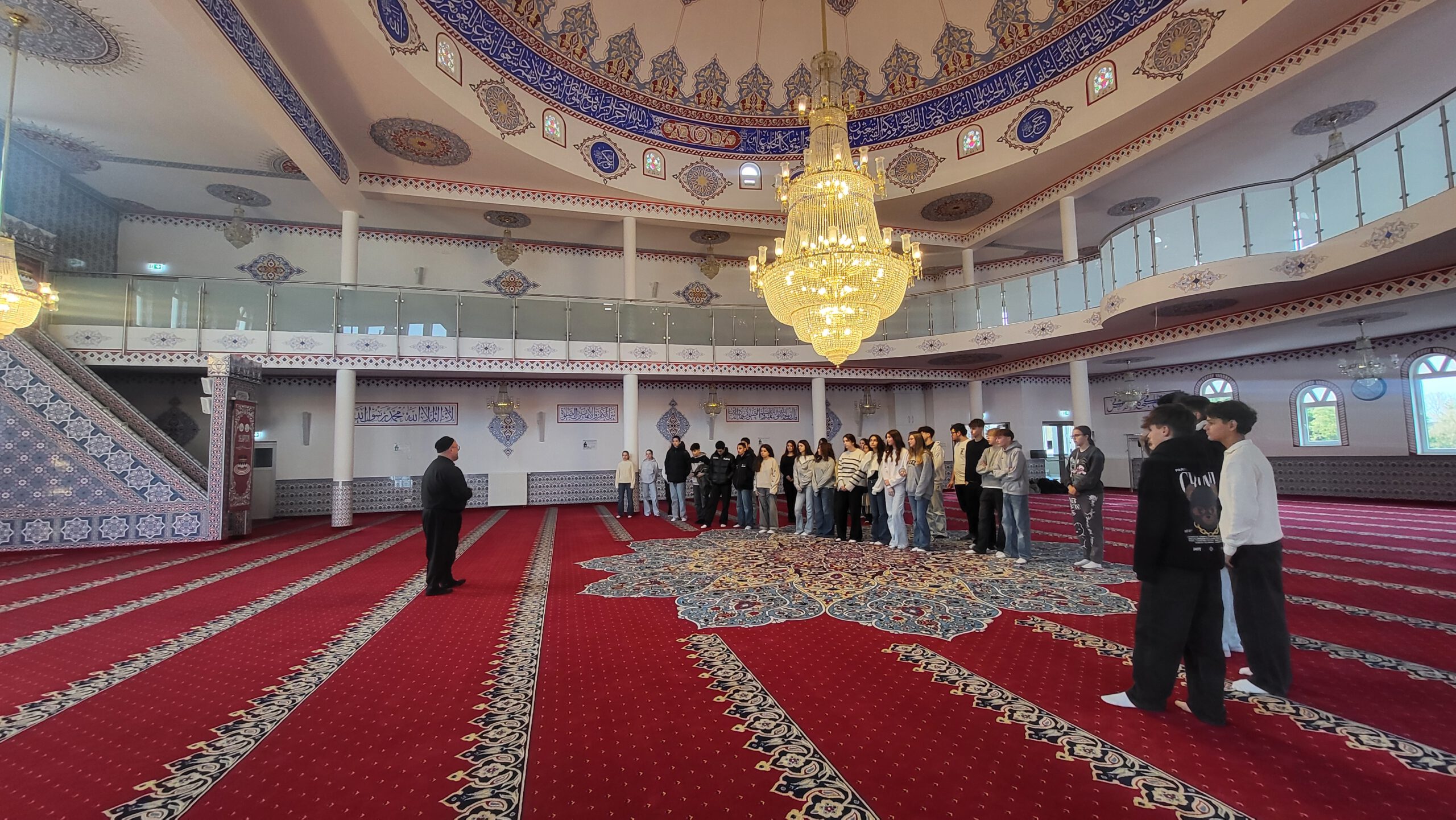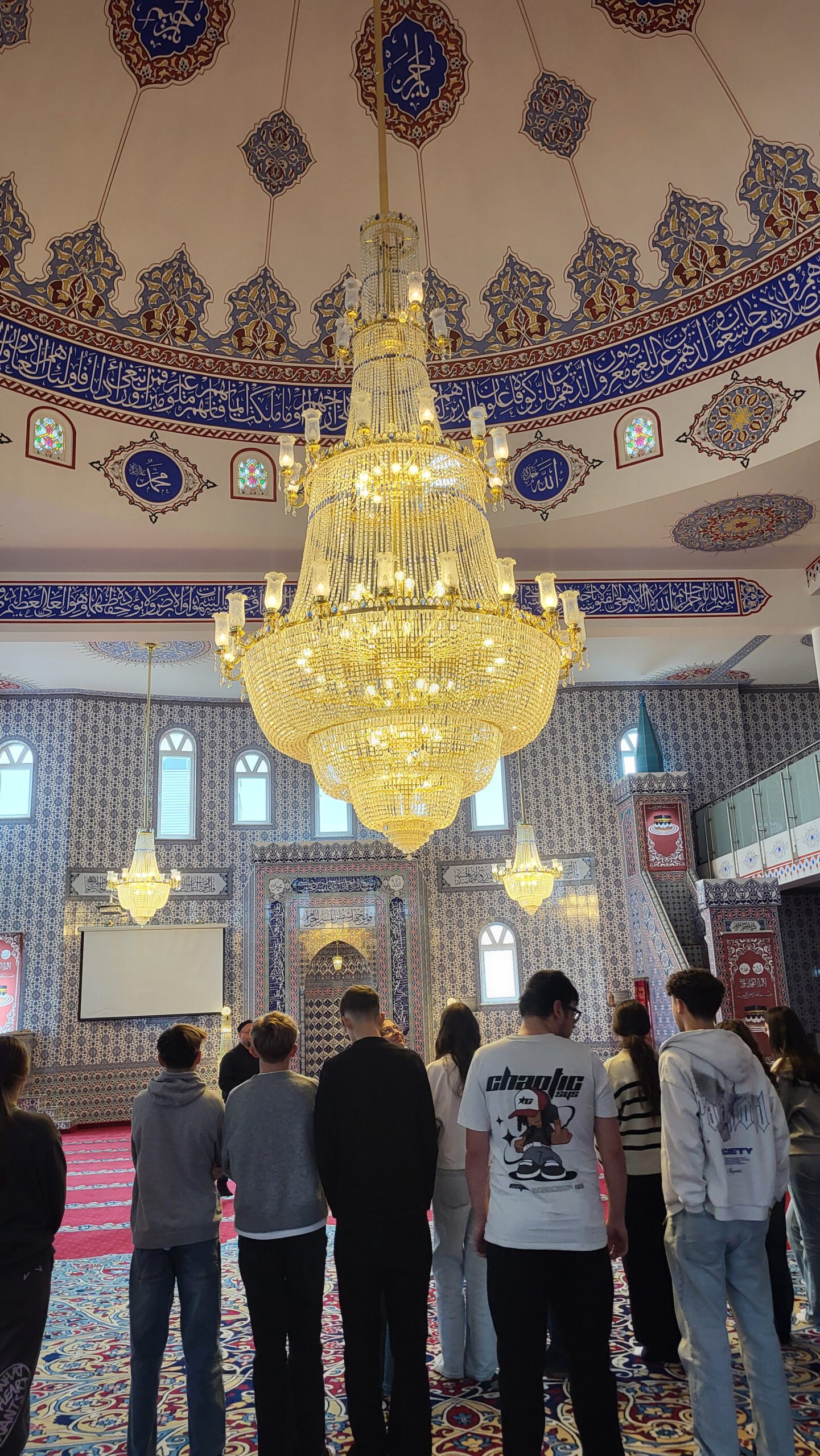 Mekka in Saudi-Arabien gilt als das Haus Gottes und wird täglich von zahlreichen Pilgernden besucht. Im Anschluss wurden wir durch die traditionellen Waschräume und den Gebetsraum geführt. Dieser ist in zwei Ebenen aufgeteilt: Im unteren Bereich beten die Männer, im oberen die Frauen. Wände und Decke sind mit Versen aus dem Koran verziert, und in der Mitte hängt ein großer Kronleuchter. Vorn befindet sich die Gebetsnische, von der aus der Imam das Gebet leitet. Rechts daneben steht die Kanzel, die für die Freitagspredigt genutzt wird. Es gibt außerdem mehrere Unterrichtsräume, in denen kostenloser Religionsunterricht für Kinder und Jugendliche angeboten wird. Nach dem Rundgang, saßen wir im Versammlungsraum zusammen. Dort bot uns die Gemeinde Süßigkeiten sowie auch traditionellen Schwarztee, den man auch Çay nennt, an.