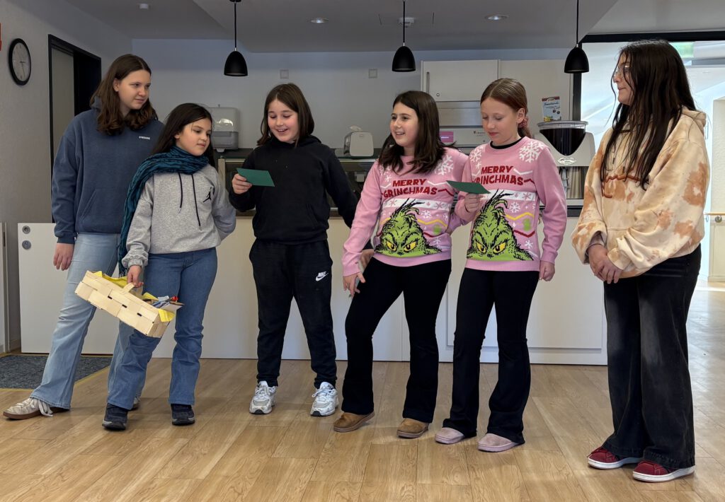 An zwei Dienstagen machten sich die Mädchen zusammen mit der AG-Leiterin Katja Reinhard persönlich auf den Weg ins Wolfgangstift, um nicht nur ihren Kalender zu überreichen, sondern auch einen Eindruck vom Alltag dort zu gewinnen. Beim ersten Besuch trafen sie pünktlich zur Kaffeezeit ein – im Gepäck ein gut gefülltes Körbchen und ein kleines weihnachtlich-sportliches Mitmachprogramm inklusive dem „Schneeengel im Sitzen“.